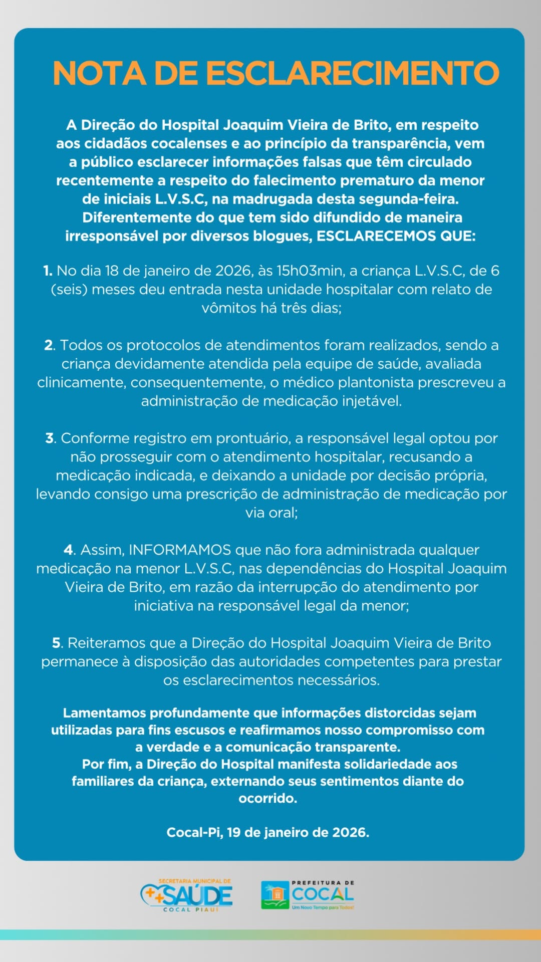 A Direção do Hospital Joaquim Vieira de Brito divulgou uma nota de esclarecimento para rebater informações que vêm circulando sobre a morte da bebê de iniciais L.V.S.C.. Segundo o hospital, há divulgação de conteúdos falsos e distorcidos sobre o caso.