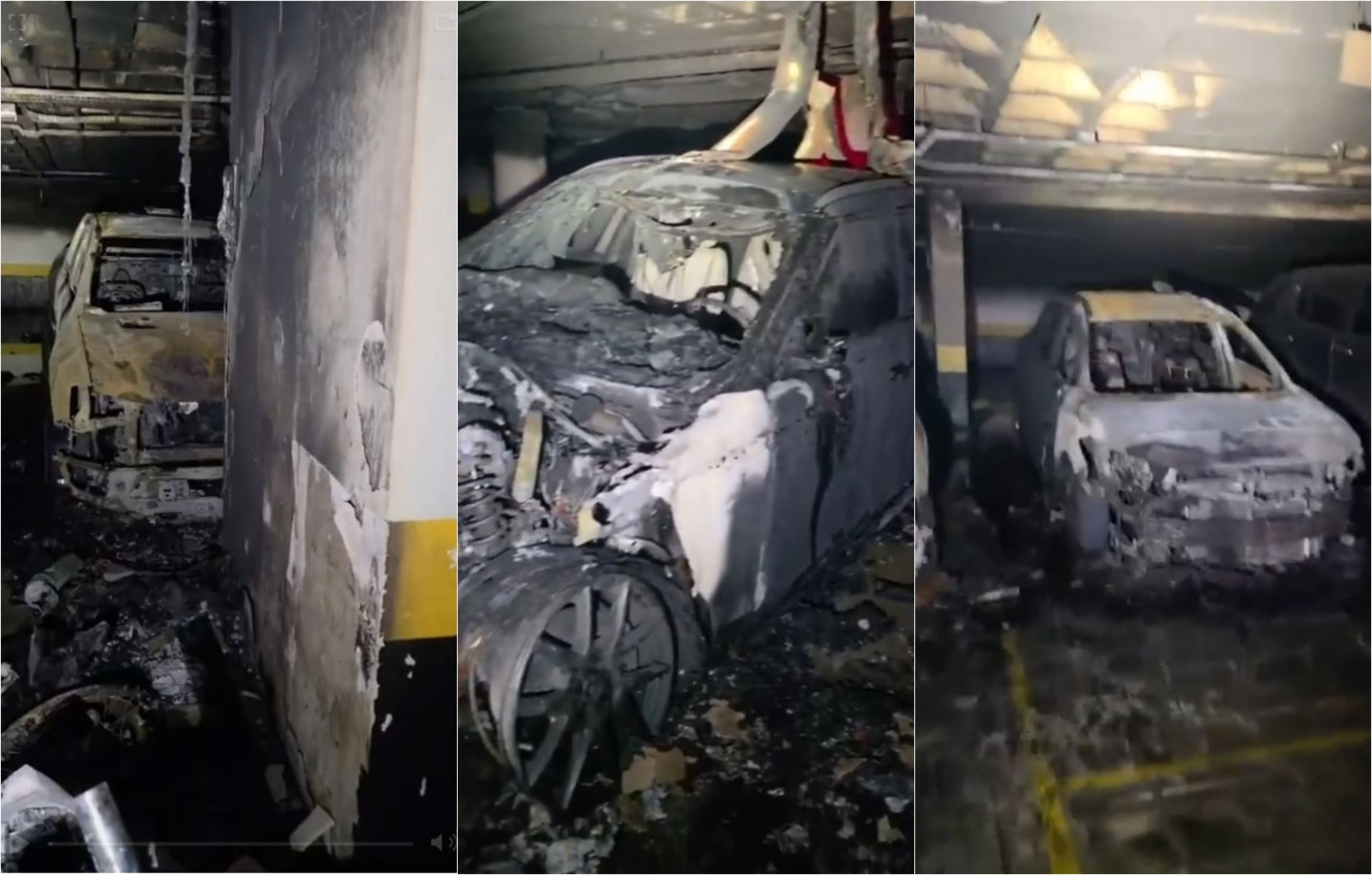Incêndio no subsolo de um condomínio destruiu quatro carros, um deles elétrico, e duas motos. Foto: Reprodução/Internet