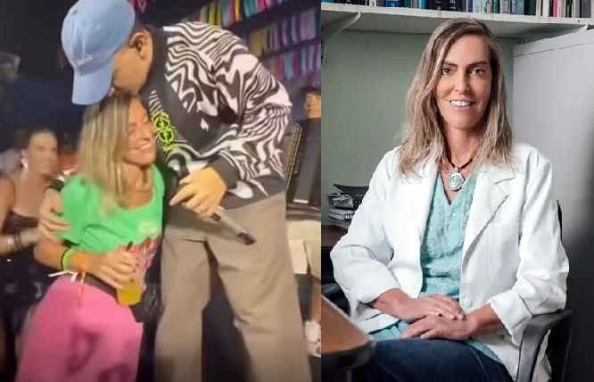 Sob aplausos do público, a pesquisadora encostou no palco e abraçou o cantor. Aos 59 anos, Tatiana se tornou um dos nomes mais comentados do país após o avanço de sua pesquisa com a polilaminina, substância desenvolvida ao longo de quase três décadas de estudos.
