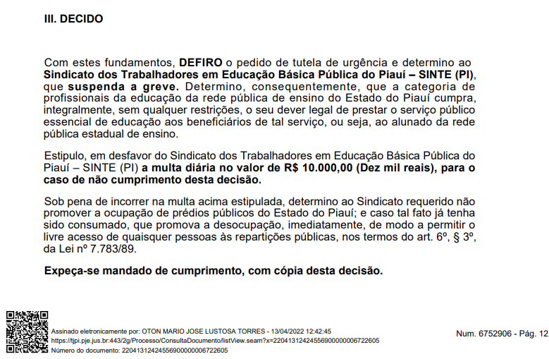 "Com estes fundamentos, DEFIRO o pedido de tutela de urgência e determino ao Sindicato dos Trabalhadores em Educação Básica Pública do Piauí – SINTE (PI), que suspenda a greve. Determino, consequentemente, que a categoria de profissionais da educação da rede pública de ensino do Estado do Piauí cumpra, integralmente, sem qualquer restrições, o seu dever legal de prestar o serviço público essencial de educação aos beneficiários de tal serviço, ou seja, ao alunado da rede pública estadual de ensino", diz o desembargador na decisão.