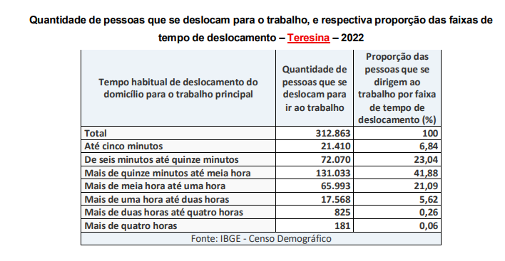 Em contrapartida, na capital Teresina, o cenário é diferente. Pelo menos 41,88% dos trabalhadores levam entre 15 e 30 minutos para chegar ao emprego, enquanto 23,04% gastam de 6 a 15 minutos no deslocamento. O tempo maior de viagem reflete o tamanho da cidade e o aumento da mobilidade urbana, fatores que influenciam diretamente o cotidiano da população economicamente ativa.