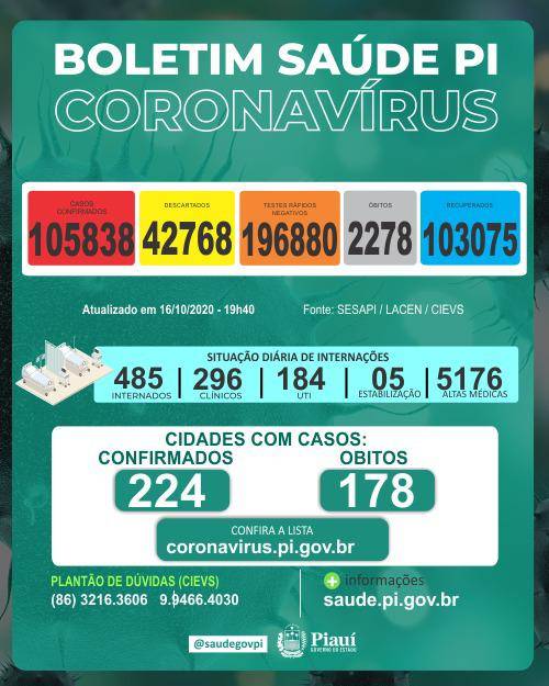 Dos leitos existentes na rede de saúde do Piauí para atendimento à Covid-19, há 485 ocupados, sendo 296 leitos clínicos, 184 UTIs e 5 leitos de estabilização. As altas acumuladas somam 5.176 até o dia 16 de outubro.
