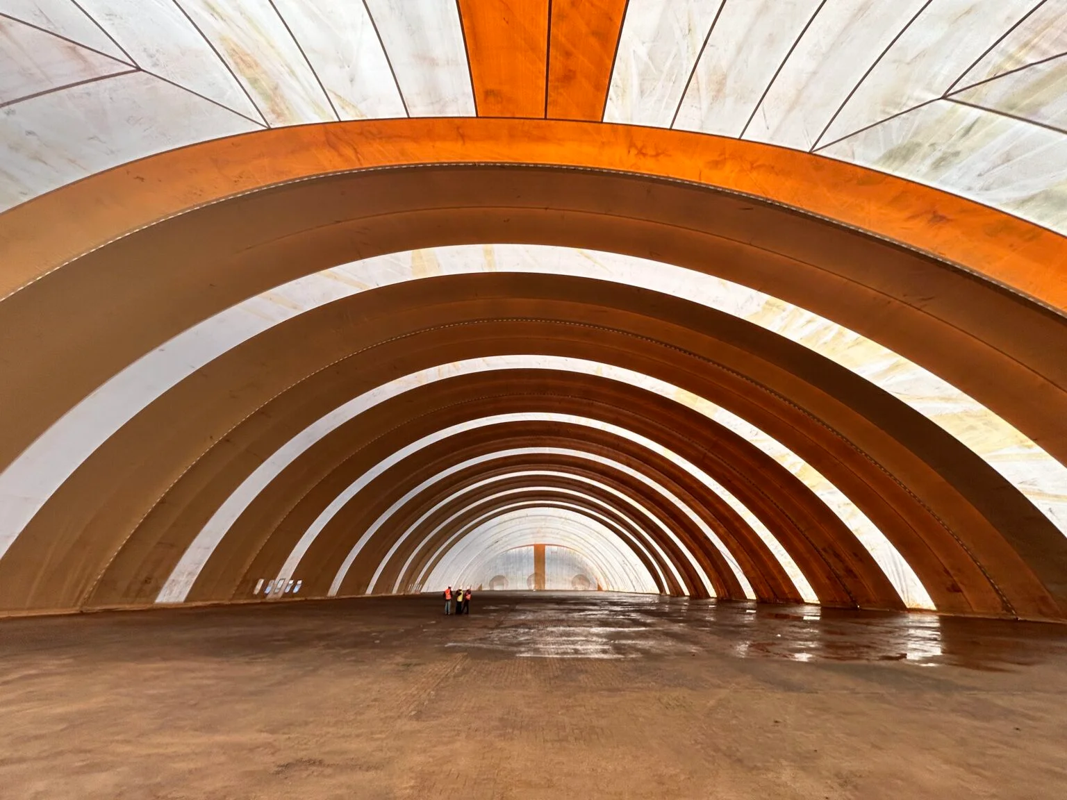 Diferente de modelos convencionais, o galpão é inflável. A estrutura é fixada ao solo por estacas e mantida por um sistema de aerogeradores especiais