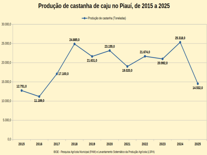 A produção de castanha de caju no Piauí registrou forte queda em 2025 e totalizou apenas 14,5 mil toneladas, redução de 42,6% em relação a 2024, quando o estado produziu 25,3 mil toneladas. Os dados são do Levantamento Sistemático da Produção Agrícola (LSPA), divulgado pelo Instituto Brasileiro de Geografia e Estatística (IBGE).