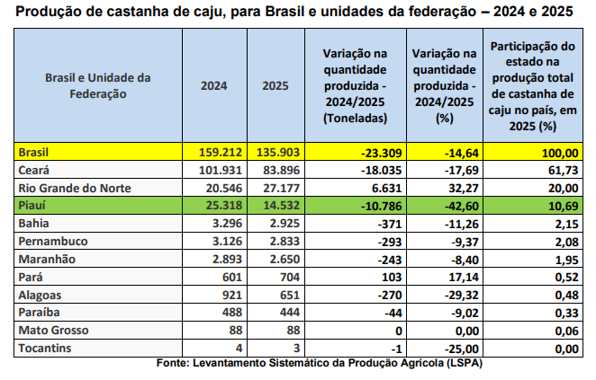 “A produção de castanha de caju no estado sofreu queda expressiva em 2025 em razão da falta de chuvas e da ocorrência de pragas que atacaram as áreas de cultivo”, explicou.