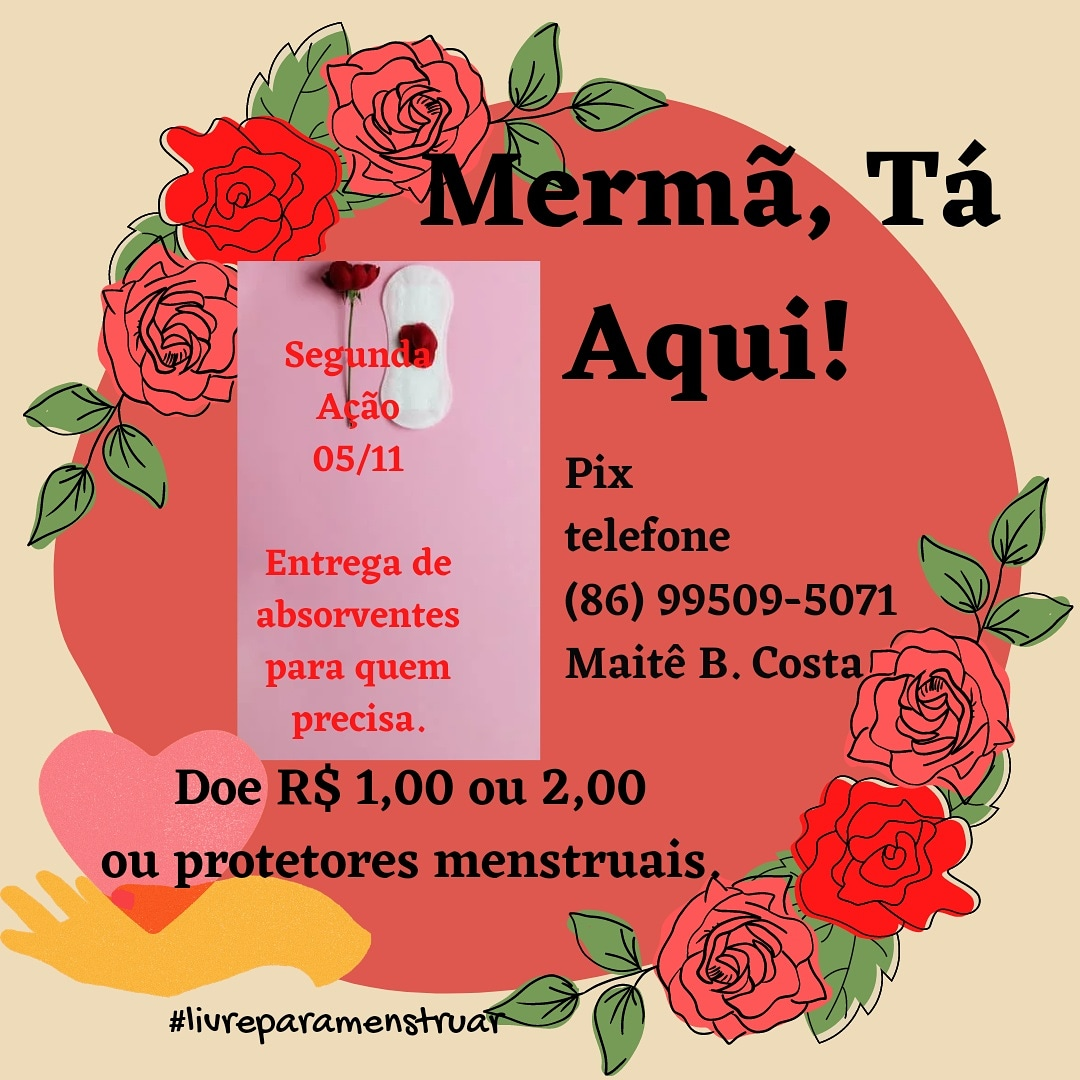 Quem deseja doar o absorvente, Maitê vai buscar em qualquer lugar. Basta mandar mensagem no direct do Instagram @merma_ ta_ aqui ou mensagem no whatsapp. “Acreditamos que cada pacote ameniza e são 8 momentos de paz e tranquilidade para uma mermã da nossa comunidade”.