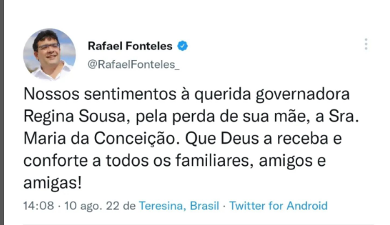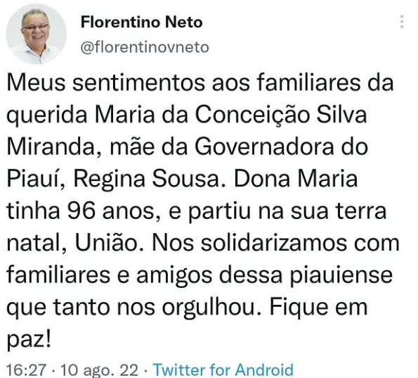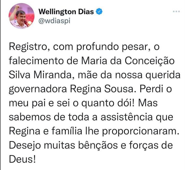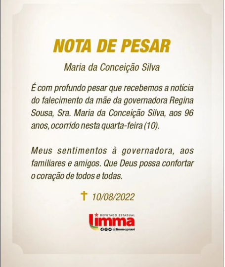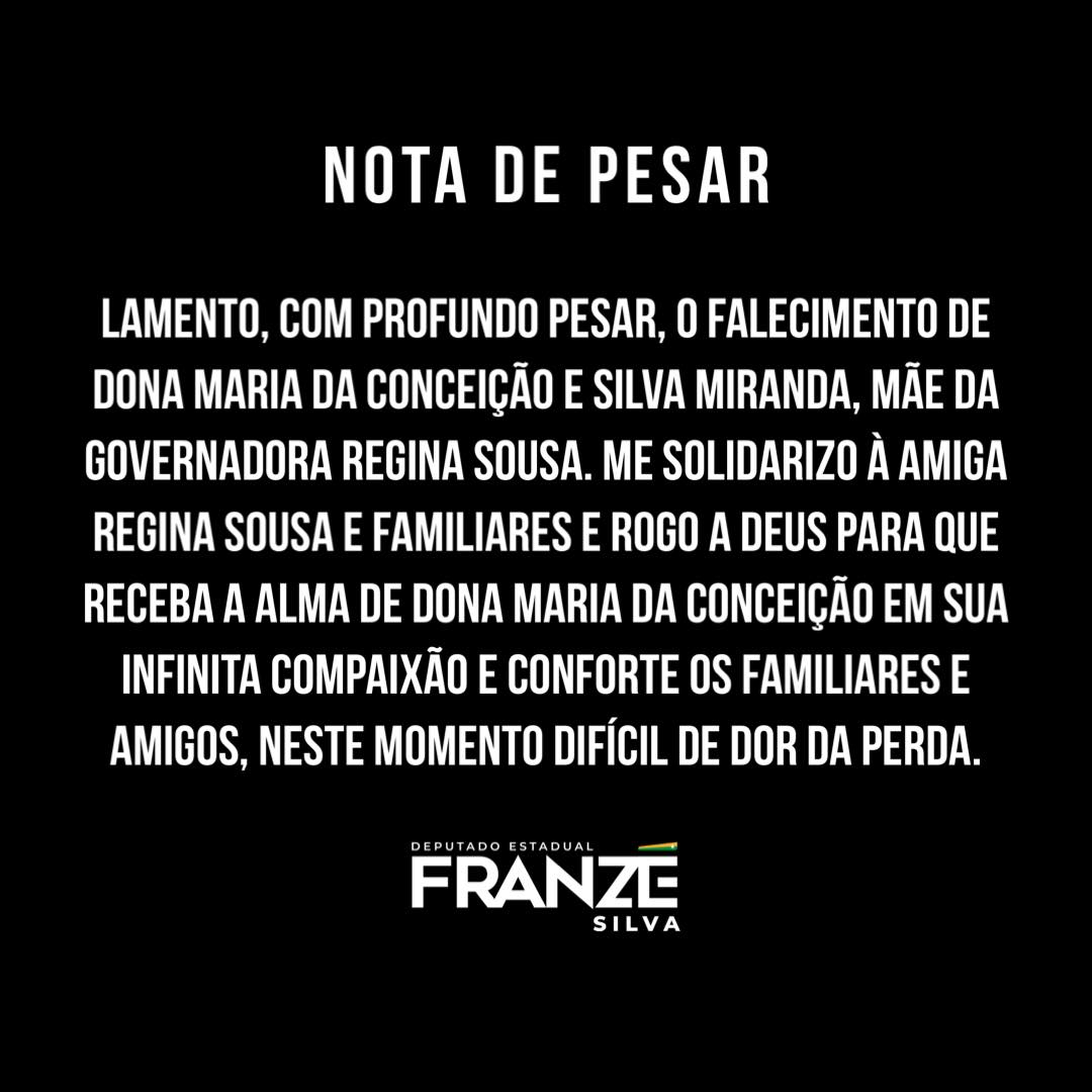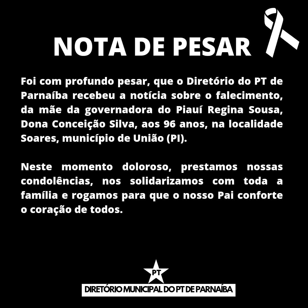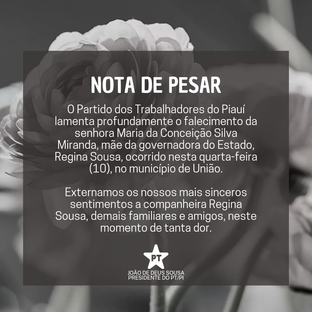 O Partido dos Trabalhadores do Piauí e políticos piauienses de vários partidos lamentaram a morte de Maria da Conceição Silva Miranda, mãe da governadora do Estado, Regina Sousa (PT). Conceição Silva faleceu na manhã desta quarta-feira (10), em União, a 64 km de Teresina.
