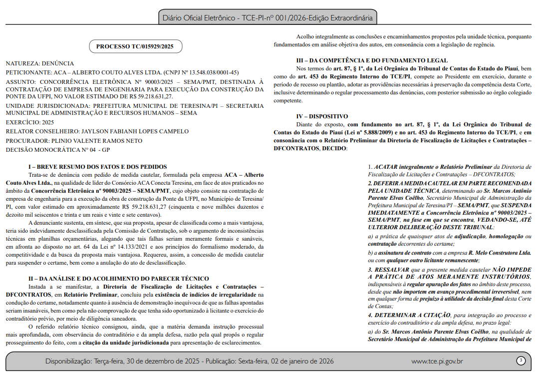 O Tribunal de Contas do Estado do Piauí (TCE-PI) determinou a suspensão imediata da licitação no valor de R$ 59.218.631,27, da Prefeitura de Teresina, para a construção da Ponte da Universidade Federal do Piauí (UFPI). A decisão cautelar foi assinada pelo conselheiro substituto Jackson Nobre Veras e publicada na edição de sexta-feira, 2 de janeiro.