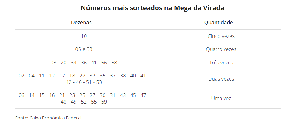 Segundo a Caixa Econômica Federal, o número 10 é o mais recorrente na história do concurso, tendo sido sorteado em cinco edições até agora.