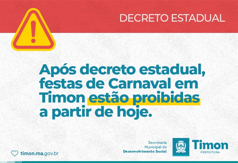 A partir desta segunda-feira (25), após decreto assinado pelo governador Flávio Dino, as festas de carnaval estão proibidas em todo Maranhão. Em Timon as comemorações, como prévias, matinês e bailes foram suspensas ainda no último dia 16 de janeiro. O objetivo é evitar aglomerações e conter o avanço do coronavírus.