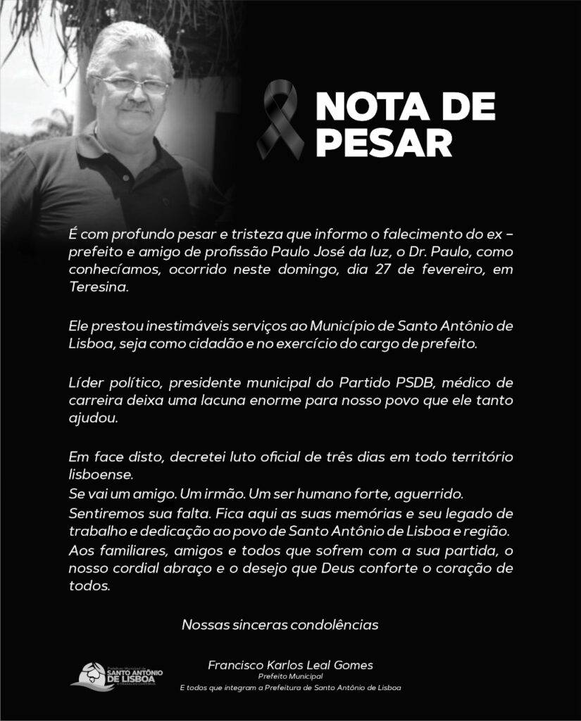 O prefeito de Santo Antônio de Lisboa, Dr. Karlão, emitiu uma nota de pesar e decretou luto oficial por três dias no município.