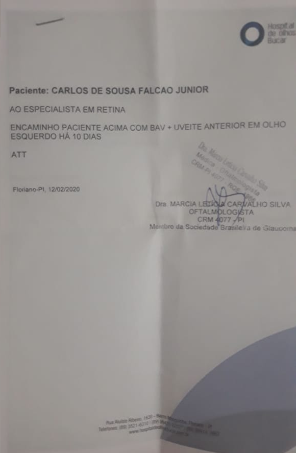 Júnior disse que procurou atendimento médico em Corrente, onde achava que fosse uma conjuntivite, mas não conseguiu resolver o problema. A situação foi piorando e ele buscou ajuda médica em Floriano, onde deu uma inflamação na retina e foi encaminhado para Teresina. "Quase perdi a minha visão, quando percebi que não estava dando jeito eu corri para a capital e lá foi descoberto uma bactéria no meu olho. Eu já tinha perdido 50% da visão e foi feito uma pequena cirurgia, uma raspagem, ai voltei a recuperar a visão. Ainda estou em tratamento", explica.
