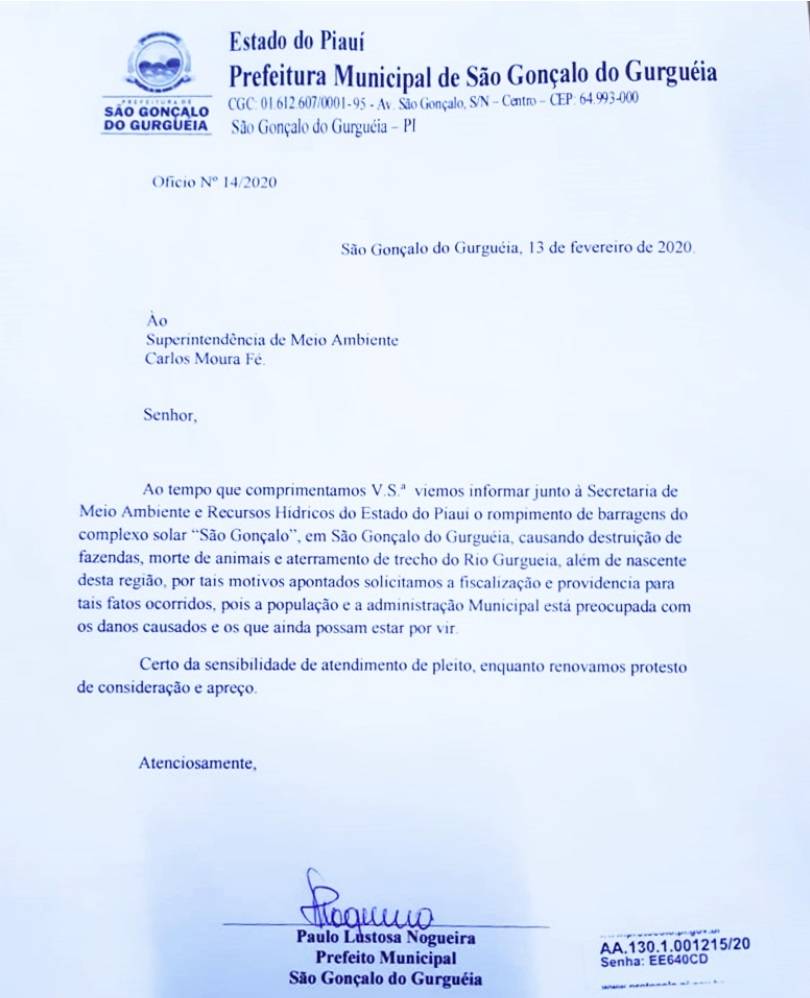 Segundo o documento entregue à Secretaria de Meio Ambiente do Estado, “o rompimento de barragens do complexo solar ‘São Gonçalo’, causou destruição de fazendas, morte de animais e aterramento de trecho do Rio Gurgueia, além de nascente desta região”. Ainda de acordo com o ofício, “a população e a administração municipal está preocupada com os danos causados e os que ainda possam estar por vir”.