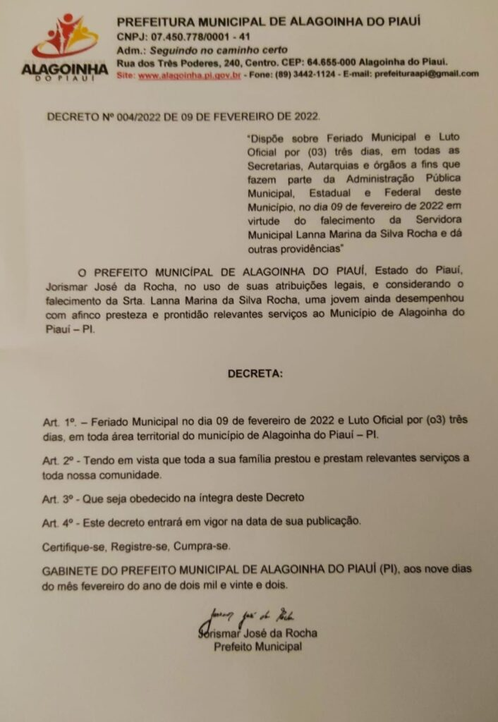 A Prefeitura também decretou luto oficial de três dias pelo falecimento da servidora. Veja o decreto: