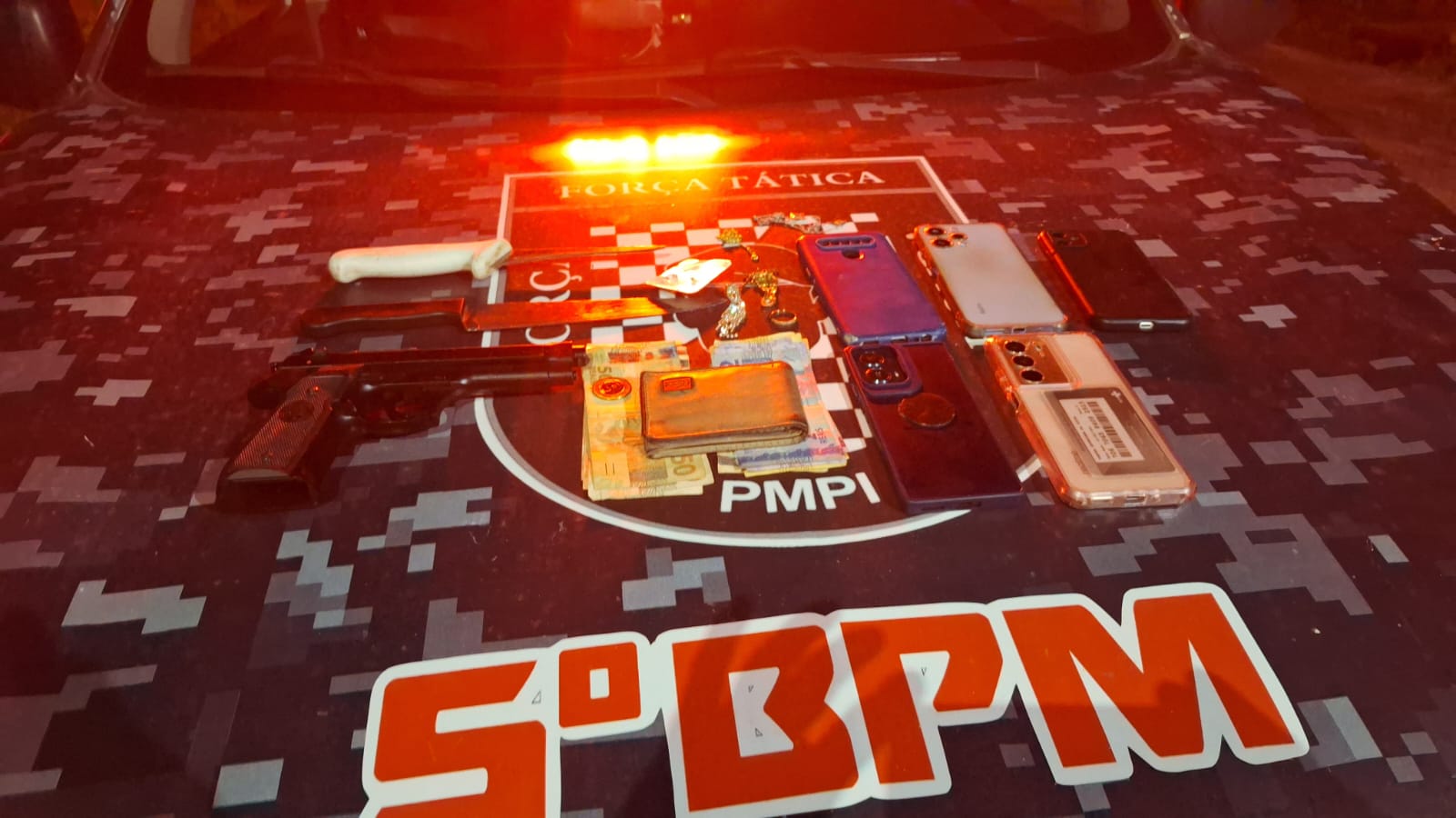 Durante a ação, foram apreendidas duas facas, um simulacro de arma de fogo do tipo pistola (airsoft), além de diversos objetos oriundos da prática criminosa.