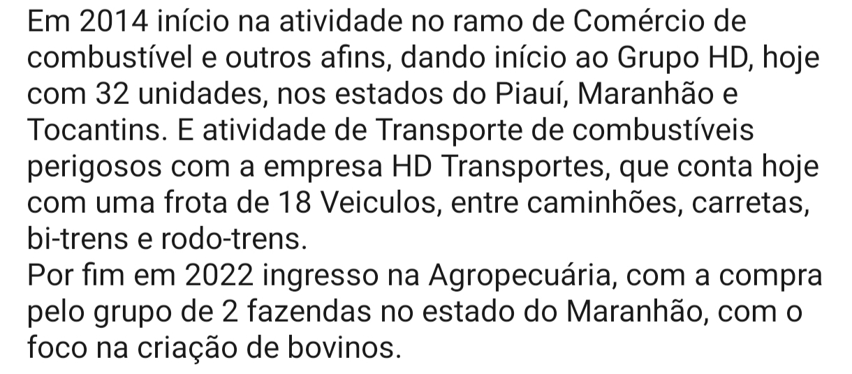 · 2014: O "grande salto" para o ramo de combustíveis, fundando o Grupo HD, que rapidamente expandiu para 32 unidades no Piauí, Maranhão e Tocantins, além da HD Transportes.