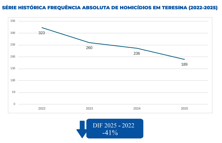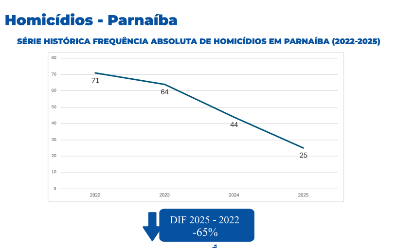Os homicídios também seguiram a curva de redução. Em 2025, foram registrados 526 casos, contra 756 em 2022, o que corresponde a uma diminuição de 30%. Em Teresina, a capital, o recuo foi ainda mais acentuado, chegando a 41,5%. Já em Parnaíba, no litoral do Estado, a redução alcançou 65% em comparação com os números de 2022.