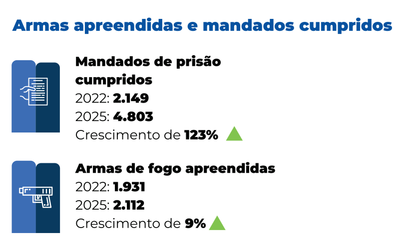Além da redução da criminalidade, o relatório evidencia o fortalecimento das ações policiais. O número de mandados de prisão cumpridos cresceu 123% entre 2022 e 2025, e as apreensões de armas de fogo aumentaram 9%. Também houve diminuição nas mortes causadas por acidentes de trânsito.