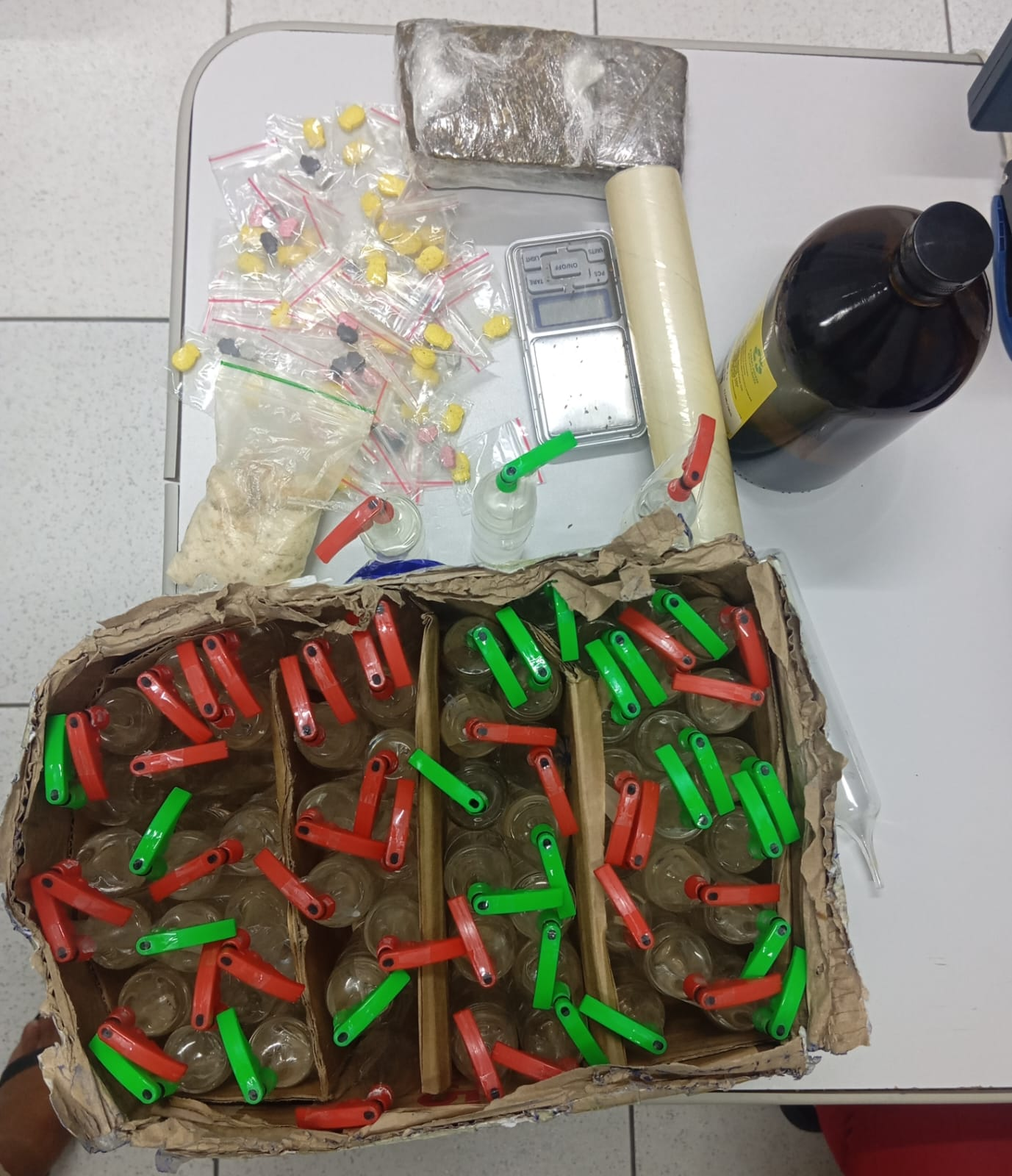 Com autorização da proprietária do imóvel, os policiais realizaram buscas na casa e encontraram o material no quarto do filho da moradora. Além dos comprimidos de ecstasy e dos frascos de lança-perfume, foram apreendidos dois pedaços prensados de maconha, um pacote pequeno de substância análoga a crack, uma balança de precisão, dois rolos de papel filme e um recipiente de grande porte contendo lança-perfume.