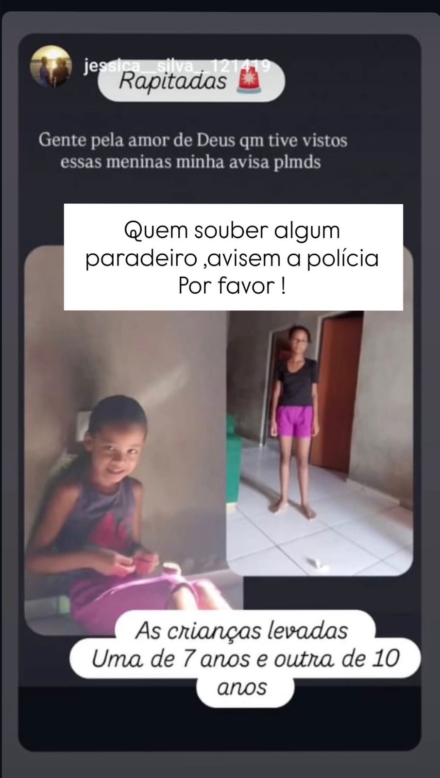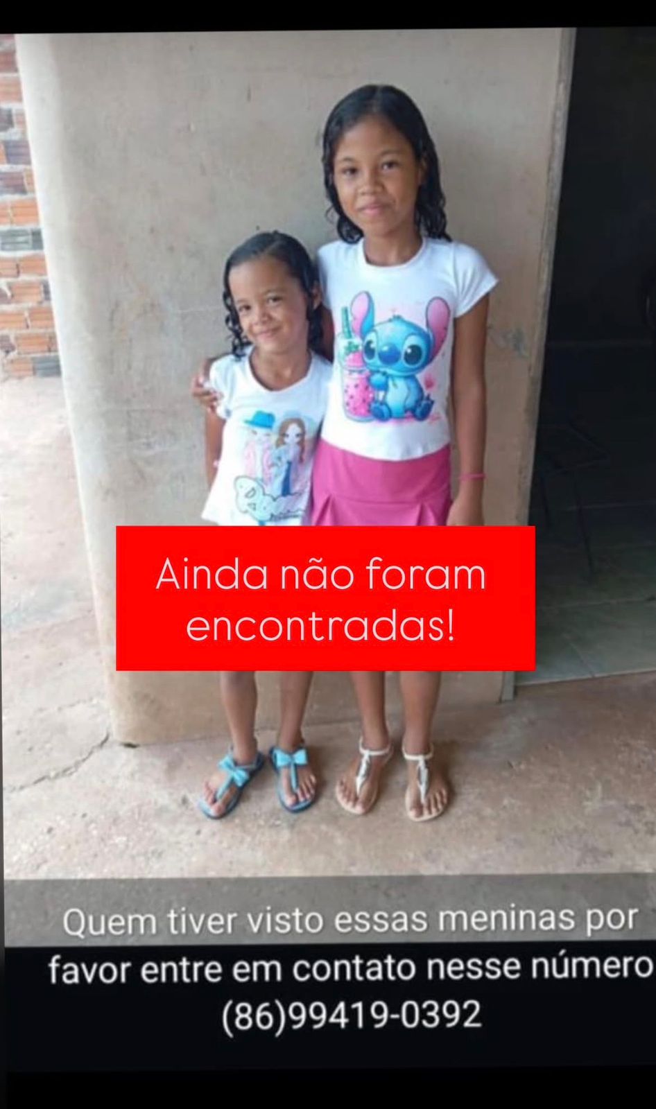 Nas redes sociais, familiares divulgaram a foto das duas crianças — cujos nomes não foram informados — e disponibilizaram um contato para quem tiver informações sobre as meninas desaparecidas.