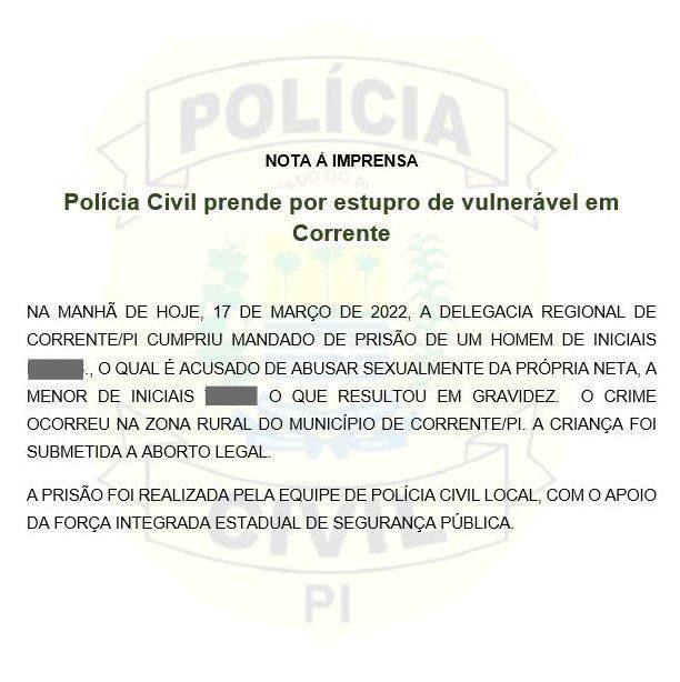 Um homem que não teve o nome revelado, foi preso nessa segunda-feira (17), acusado de estuprar e engravidar a própria neta menor de idade na zona rural de Corrente, no Sul do Piauí, De acordo com a Polícia Civil, a criança fui submetida a aborto previsto em lei.