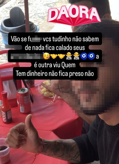 Após ser liberado, o suspeito utilizou as redes sociais para debochar da situação e comemorar a decisão judicial. Em uma das publicações, ele escreveu: “Quem tem pano pra manga já sabe né”, ao compartilhar a imagem da decisão.