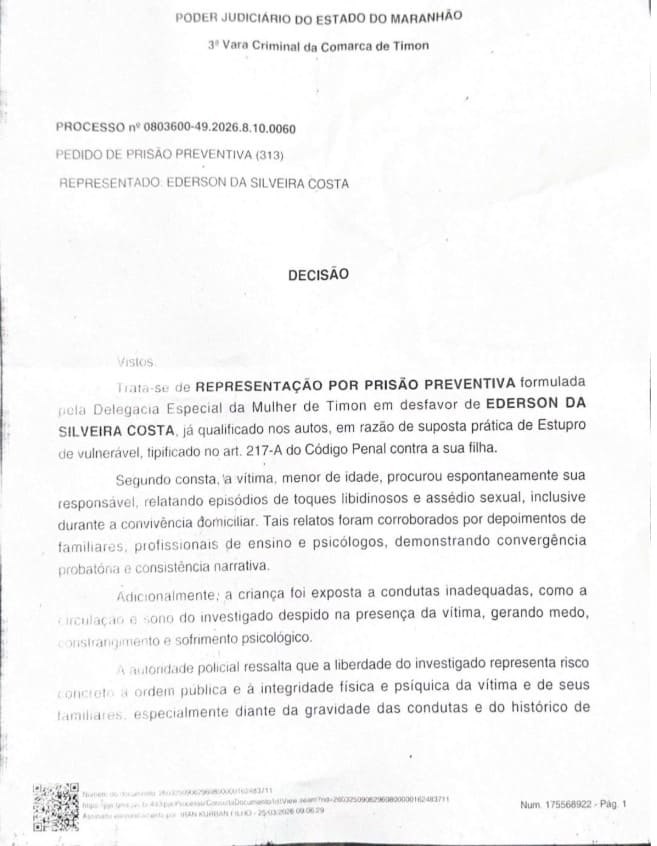 O suplente de vereador Ederson da Silveira Costa foi preso nesta quarta-feira (25/03), na cidade de Timon (MA), acusado de suposto estupro de vulnerável contra a própria filha. Segundo informações da 3ª Vara Criminal da Comarca de Timon, a menor de idade procurou sua responsável e relatou situações de toques libidinosos e assédio sexual, inclusive durante o convívio familiar.