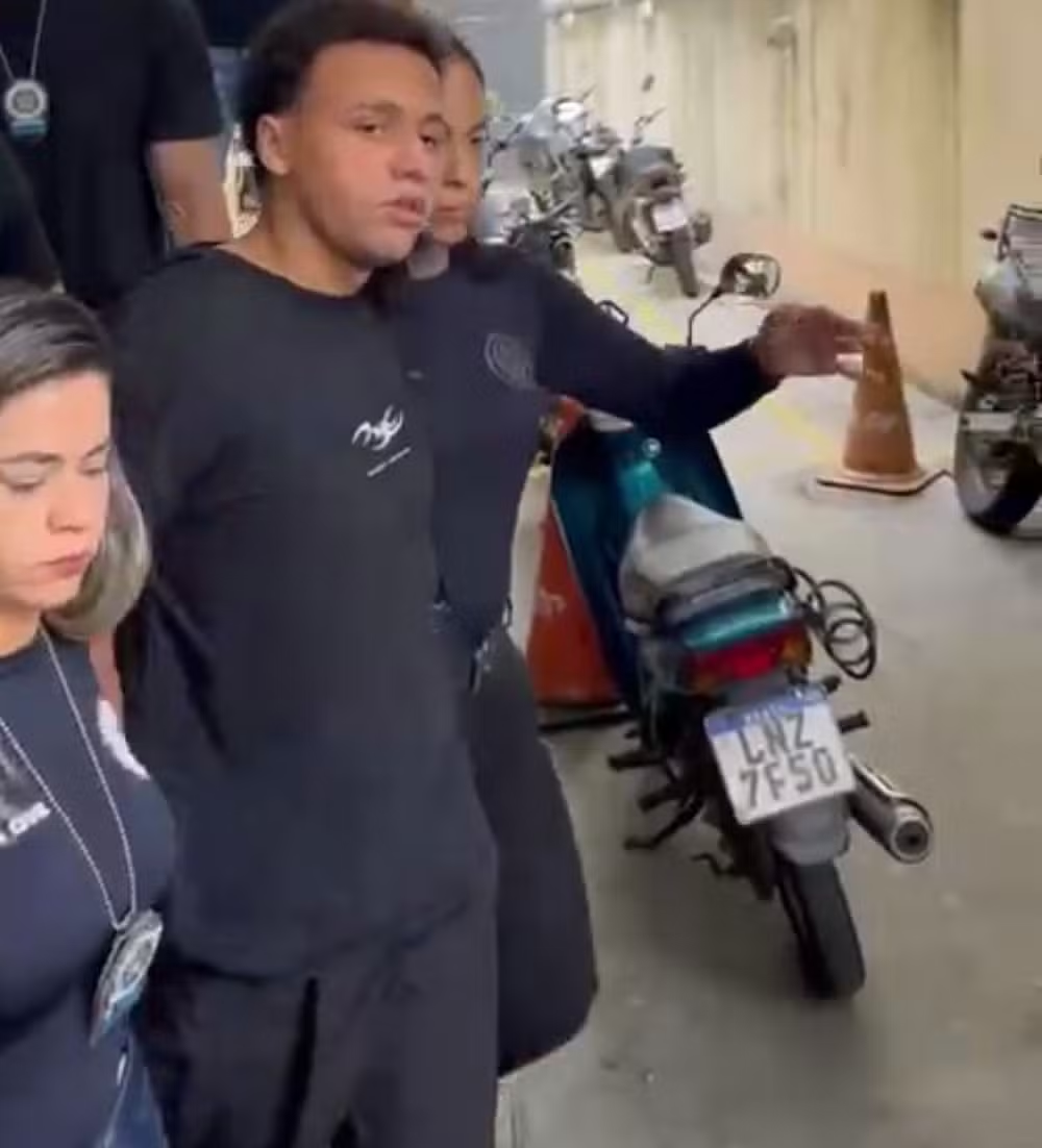 Uma multidão se formou durante a transferência de Vitor Hugo para Benfica. Revoltados, populares gritaram “estuprador”. Diante da aglomeração, os policiais deixaram a delegacia às pressas.