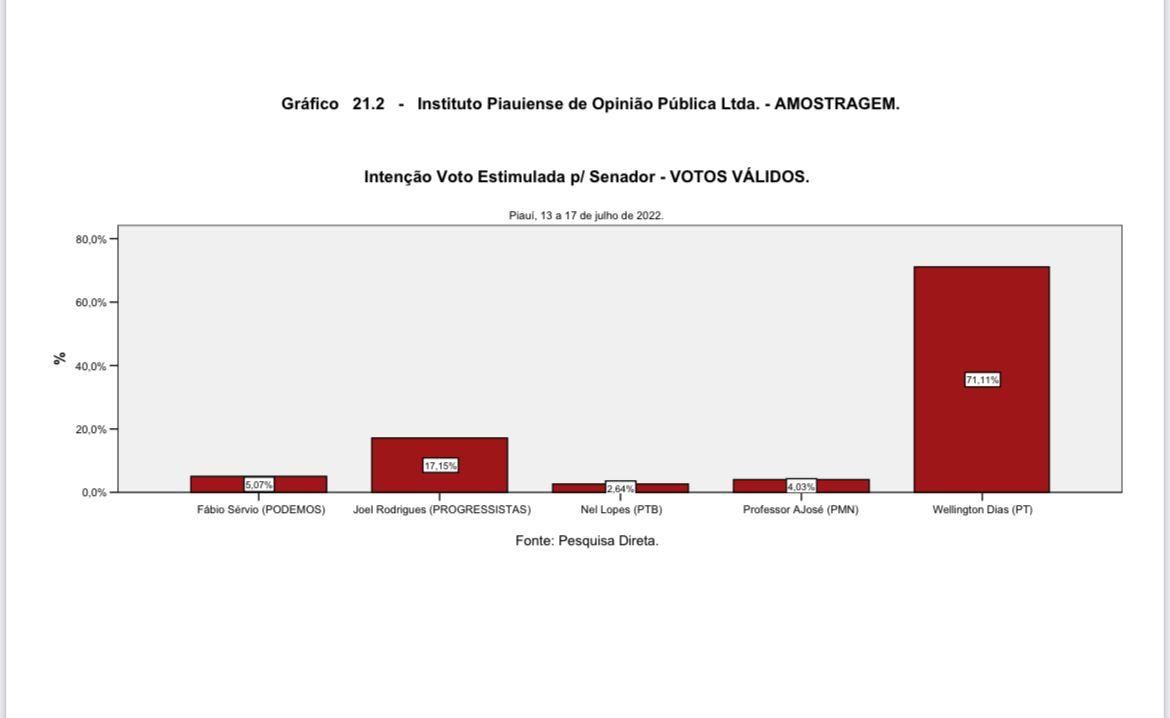 A pesquisa Amostragem, divulgada nessa terça-feira (19), revela que o ex-governador Wellington Dias (PT) venceria com facilidade a disputa para o Senado de acordo com a pesquisa estimulada. Se as eleições fossem hoje, o petista venceria com 71,11% dos votos válidos. Já Joel Rodrigues, do Progressistas, teria 17,15%.