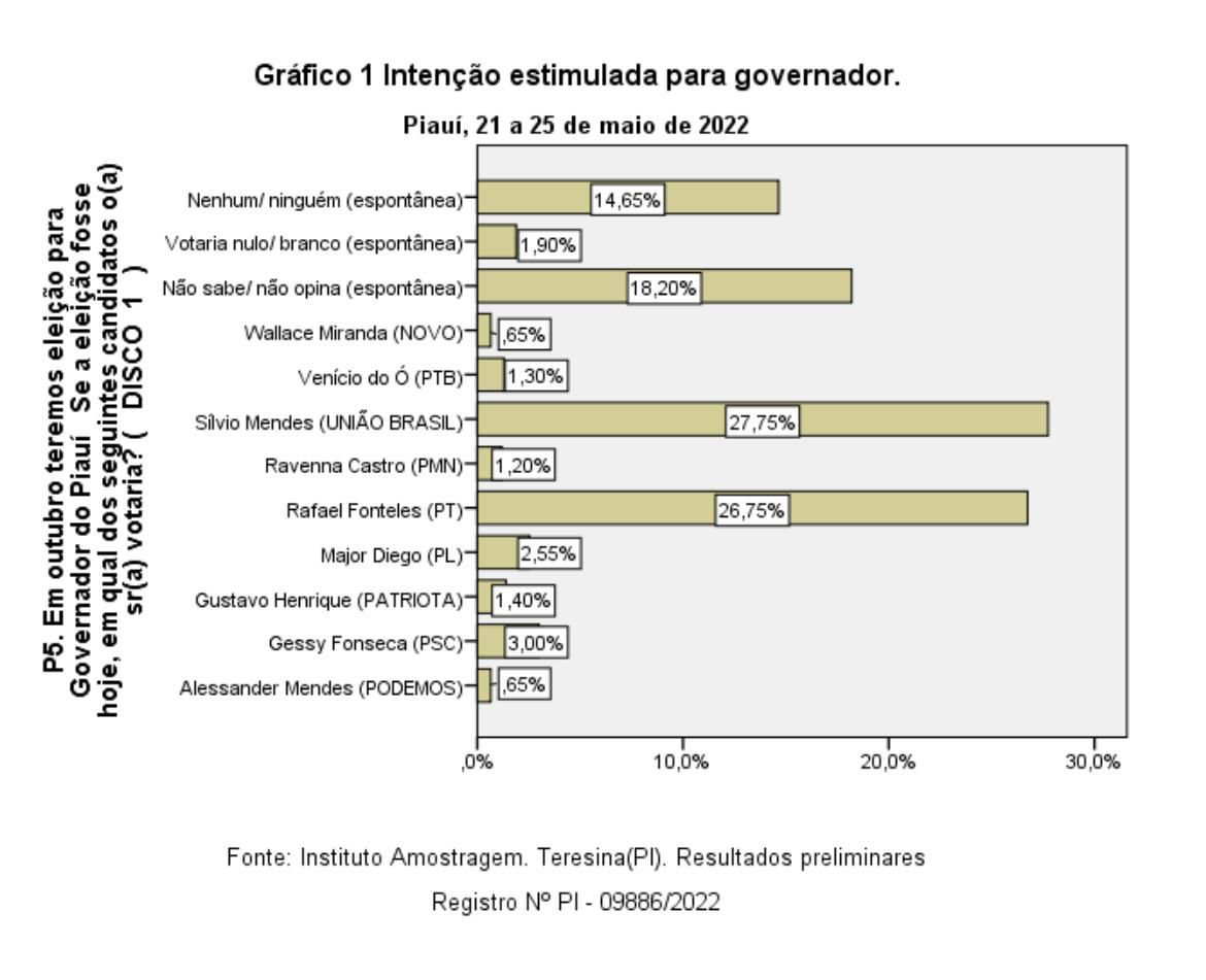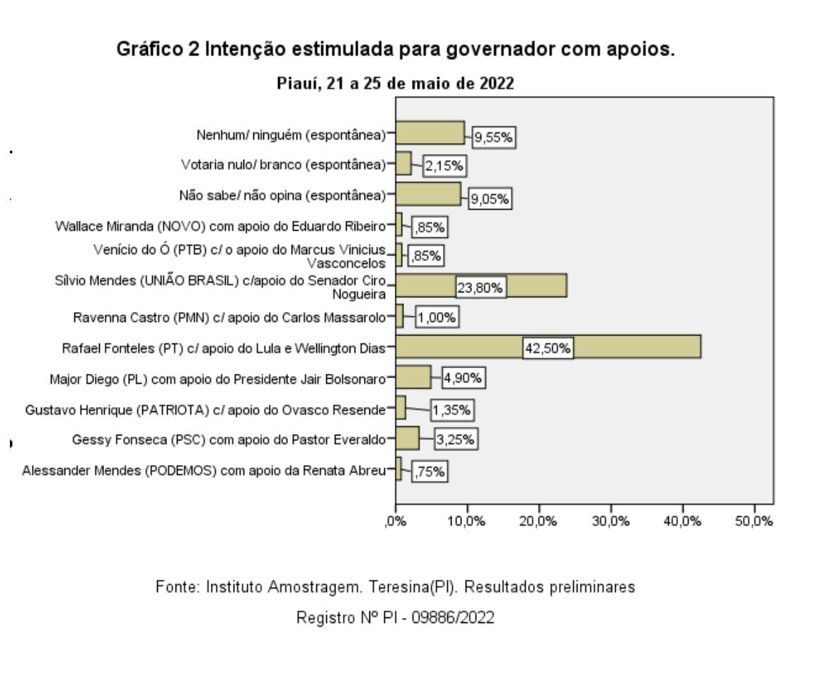 Uma nova pesquisa realizada pelo Instituto Piauiense de Opinião Pública/Amostragem, no período de 21 a 25 de maio, revela que o pré-candidato o PT, Rafael Fonteles, vence no primeiro turno as eleições para governador com o apoio de Lula e Wellington Dias, com 42,50% dos votos.