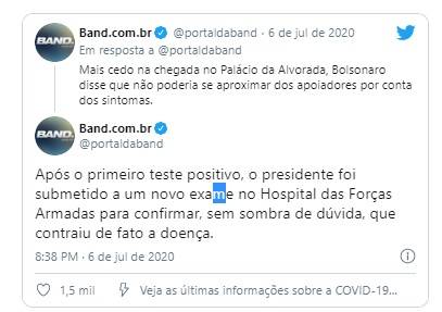 Segundo a Revista Fórum, Após o presidente Jair Bolsonaro informar que está com febre de 38 graus e suspeitas de ter sido infectado pela Covid-19, a Bandeirantes informou que o capitão da reserva testou positivo para o coronavírus.