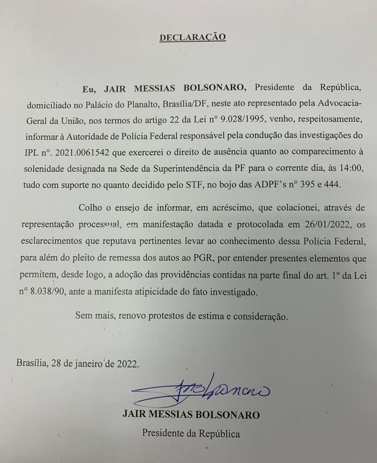 “Eu, JAIR MESSIAS BOLSONARO, Presidente da República, domiciliado no Palácio do Planalto, Brasília/DF, neste ato representado pela Advocacia-Geral da União, nos termos do artigo 22 da Lei nº 9.028/1995, venho, respeitosamente, informar à Autoridade de Polícia Federal responsável pela conclusão das investigações do IPL nº. 2021.0061542 que exercerei o direito de ausência quanto ao comparecimento à solenidade designada na Sede da Superintendência da PF para o corrente dia, às 14:00, tudo com suporte no quanto decidido pelo STF, no bojo das ADPF’s nº 395 e 444″, diz um trecho da declaração.