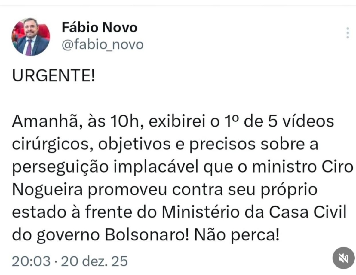 Aínda no sábado (20/12), Fábio Novo anunciou que publicaria uma série de cinco vídeos "cirúrgicos, objetivos e precisos sobre a perseguição implacável que o ministro Ciro Nogueira promoveu contra seu próprio estado à frente do Ministério da Casa Civil do Governo Bolsonaro".