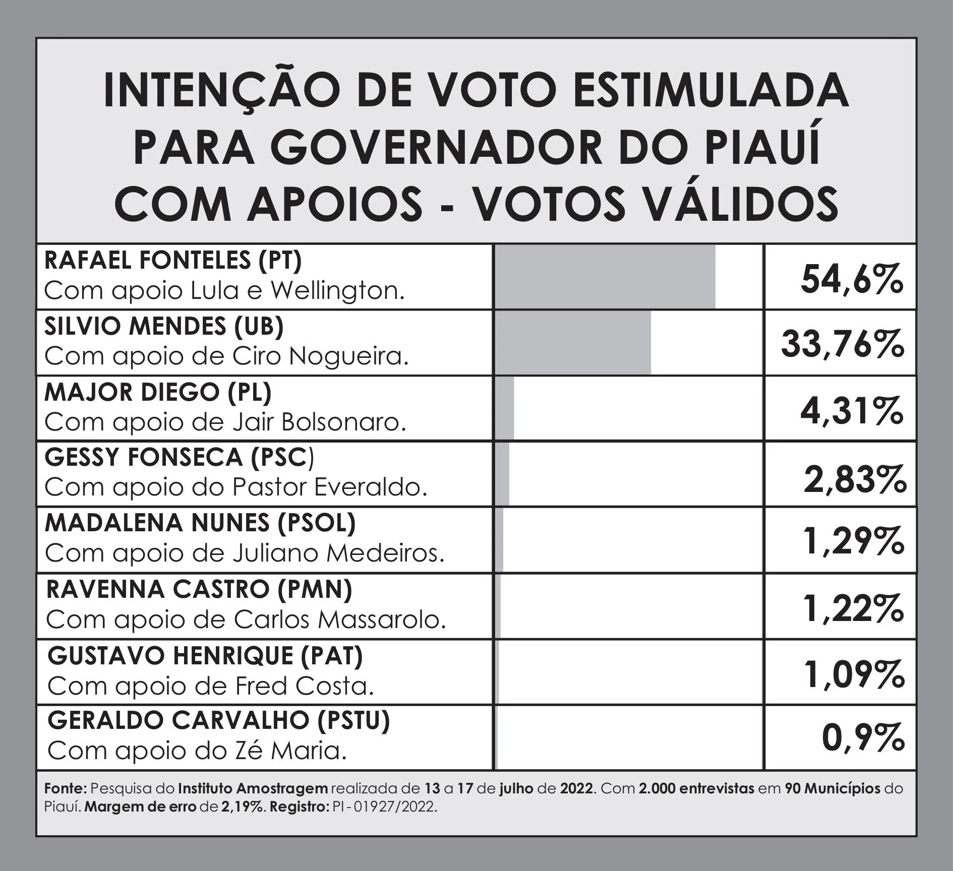 O Instituto Amostragem divulgou, nesta terça-feira (19), nova pesquisa sobre intenção de votos no Piauí. Na pesquisa de intenção de voto estimulada, o pré-candidato a governador Rafael Fonteles (PT) lidera com 54,6% dos votos válidos com apoio do pré-candidato a presidente Luiz Inácio Lula da Silva (PT) e do pré-candidato a senador Wellington Dias (PT).