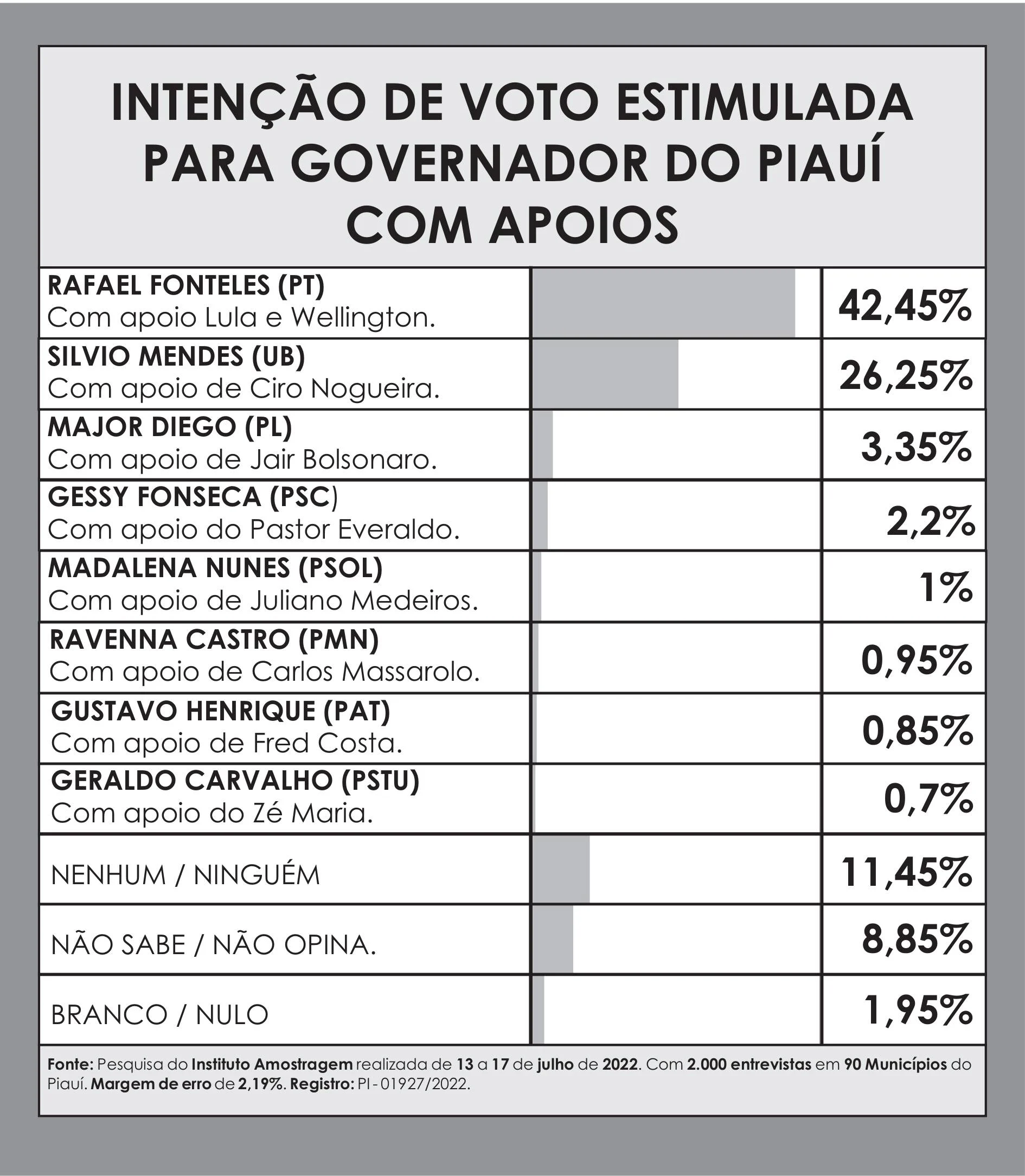 FICHA TÉCNICA - A pesquisa do Instituto Amostragem ouviu 2.000 eleitores em 90 municípios de todas as regiões do Piauí. O levantamento foi realizado de 13 a 17 de julho de 2022. O nível de confiança é de 95% e a margem de erro é de 2,19%. O registro no Tribunal Superior Eleitoral (TSE) para o cargo de presidente é o BR-05065/2022. E para o cargo de governador, senador, deputado federal e estadual é PI-01927/2022.
