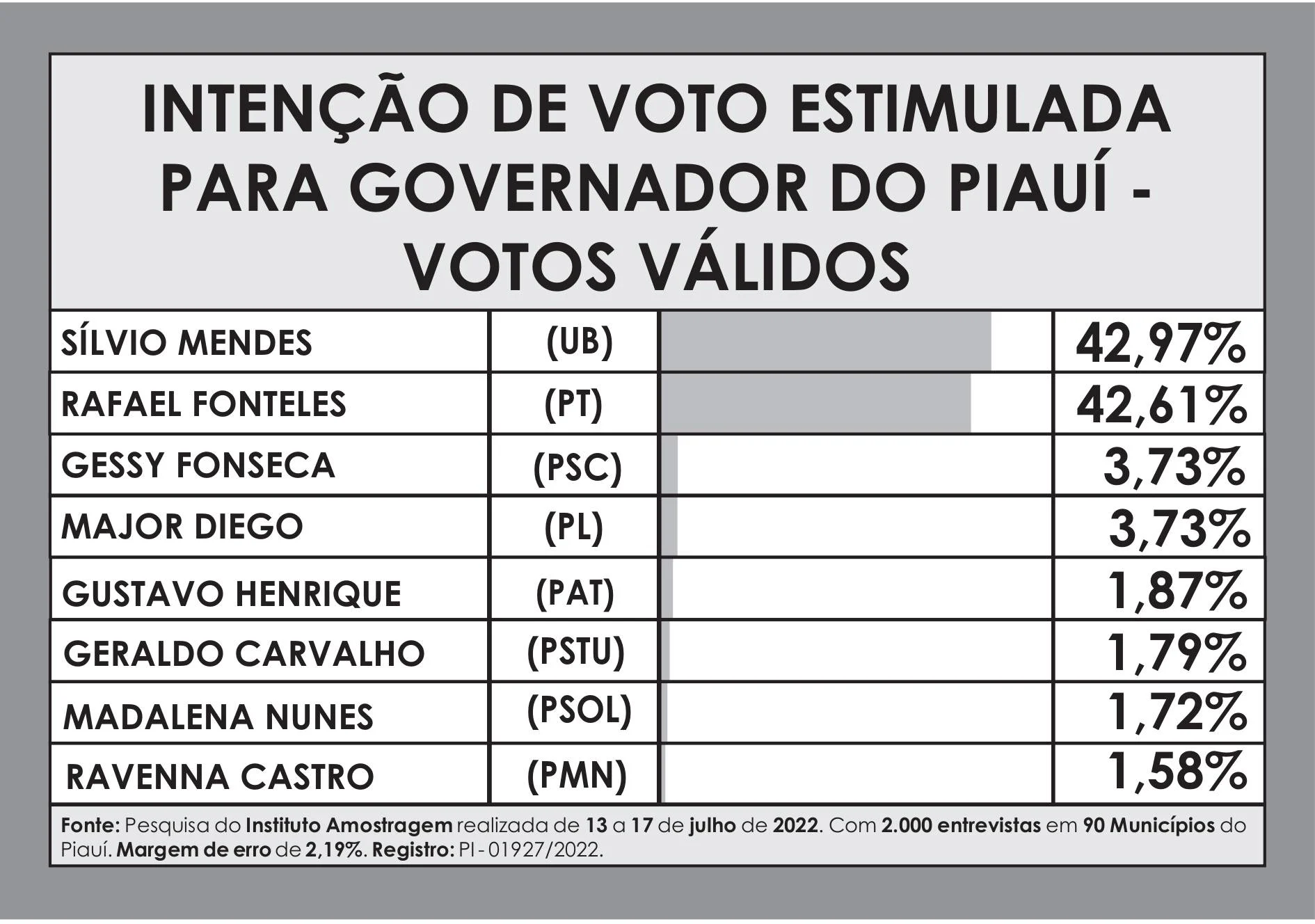 Pesquisa de intenção de voto estimulada para governador do Piauí realizada pelo Instituto Piauiense de Opinião Pública (Amostragem) revela empate técnico entre os pré-candidatos Sílvio Mendes (União Brasil) e Rafael Fonteles (PT). Sílvio tem 42,97% dos votos válidos e Rafael Fonteles soma 42,61%.