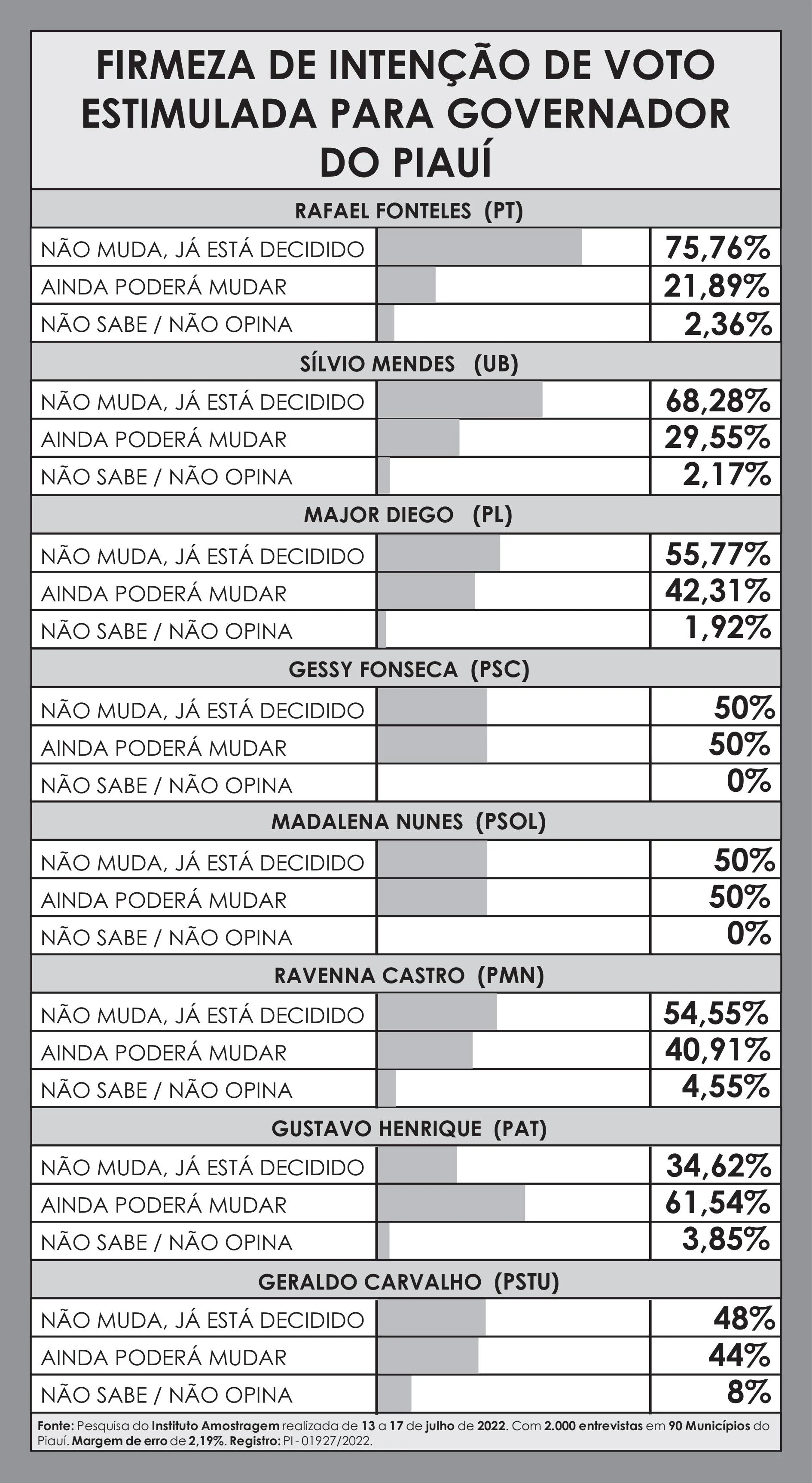 O Instituto Amostragem também questionou ao eleitor sobre a firmeza na intenção de voto para governador do Piauí. Para 75,76% dos eleitores, o voto em Rafael Fonteles (PT) não muda, já está decidido; para 21,89% ainda poderá mudar, e não souberam responder 2,36%. Já para Sílvio Mendes (União Brasil), 68,28% não muda, já está decidido; 29,55% ainda poderá mudar; e não opinaram 2,17%.