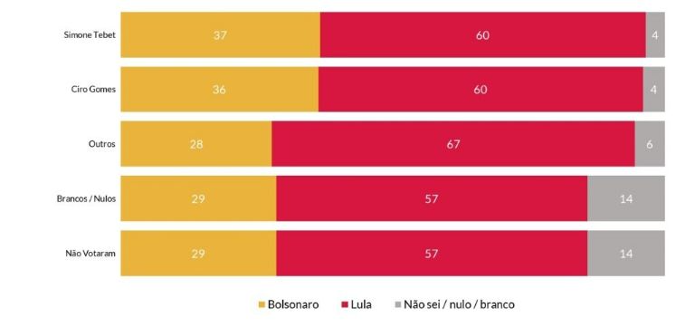 Entre eleitores que declaram terem votado tanto em Simone Tebet (MDB) quanto em Ciro Gomes (PDT) no primeiro turno, 60% dizem que Lula saiu vencedor do debate na Band, enquanto 36% citam Bolsonaro - 4% não sabem em ambos os cenários.