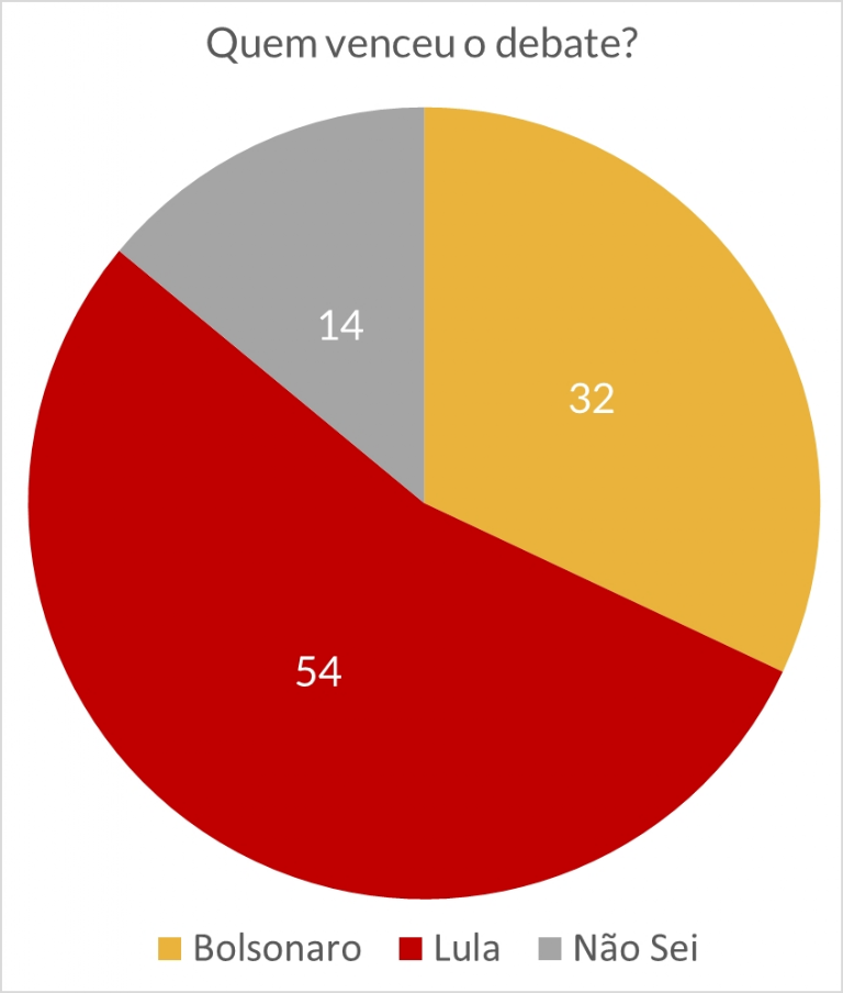 Segundo a pesquisa, 54% dizem que Lula ganhou o debate, enquanto 32% citam Bolsonaro. Outros 14% afirmam não saber.