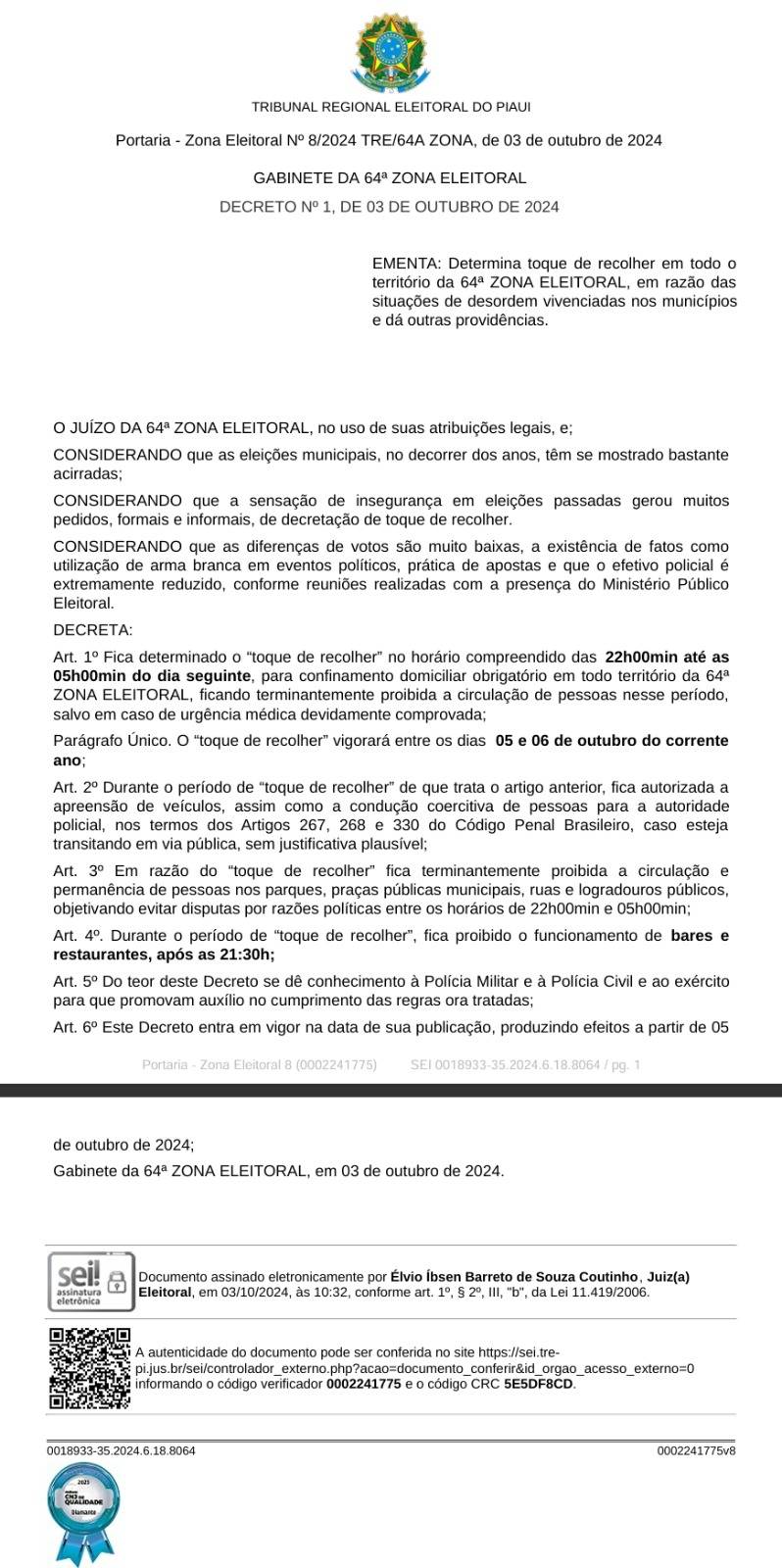 As cidades piauienses de Inhuma, Ipiranga e São José do Piauí terão "toque de recolher" entre os dias 5 e 6 de outubro, das 22h às 5h. A decisão é do juiz Élvio Íbsen Barreto de Souza Coutinho, da 64ª Zona Eleitoral, que atende os três municípios.
