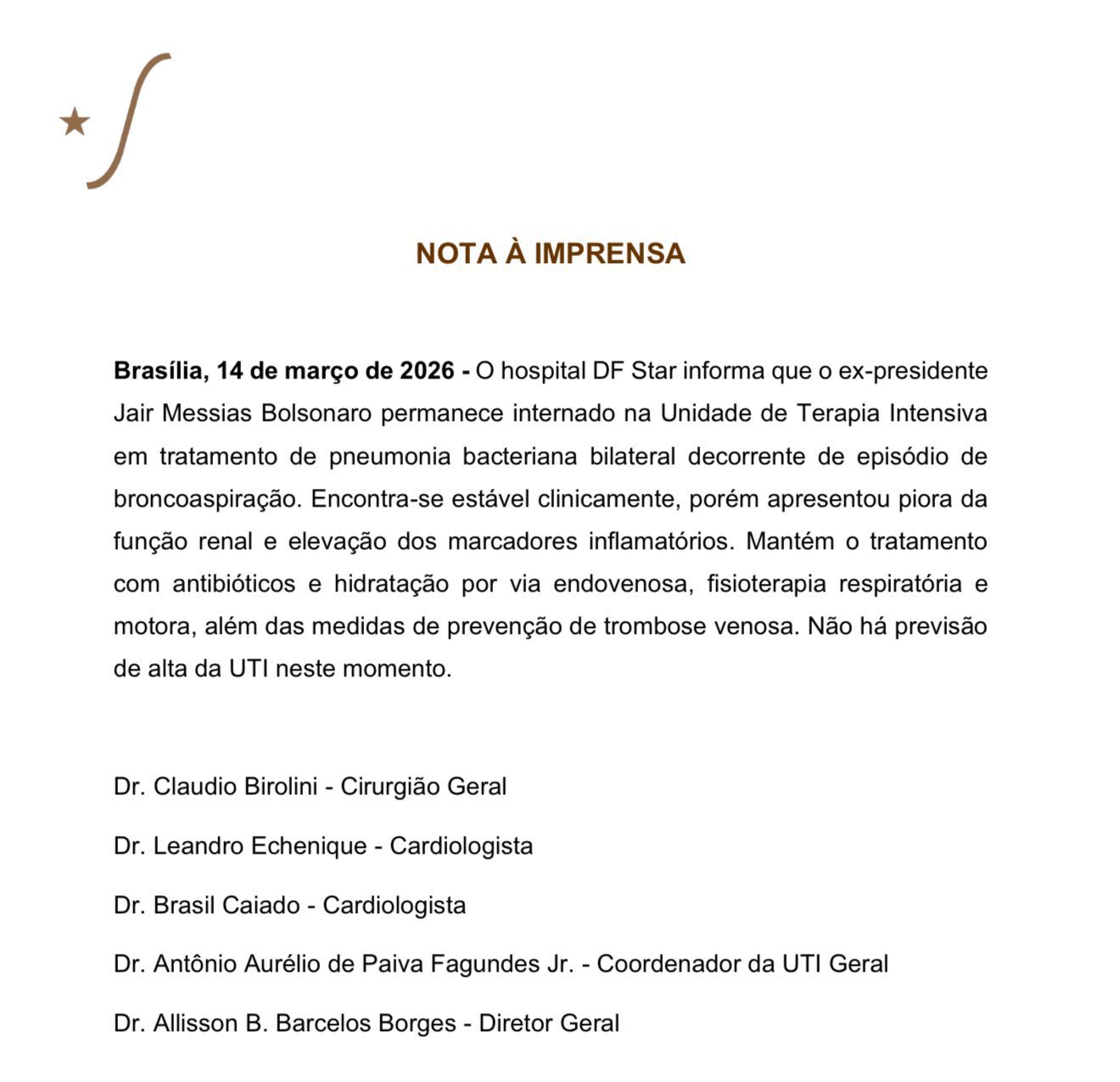 De acordo com o comunicado, Bolsonaro está clinicamente estável, mas exames recentes indicaram agravamento da função dos rins e aumento de marcadores inflamatórios no organismo, o que exige acompanhamento intensivo da equipe médica.