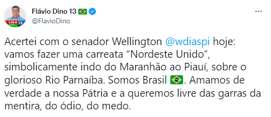 “Aceitei com o senador Wellington Dias e vamos fazer uma grande carreata “Nordeste Unido”, simbolicamente indo do Maranhão ao Piauí. Sobre o glorioso Rio Parnaíba. Somos Brasil. Amamos de verdade a nossa pátria e a queremos livre das garras da mentira, do ódio e do medo”, postou Flávio Dino.
