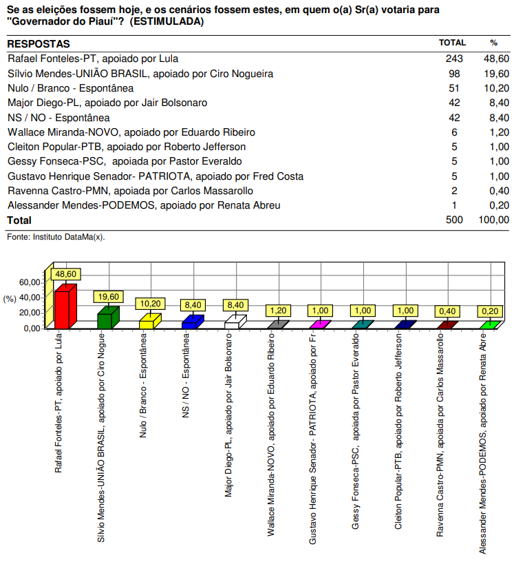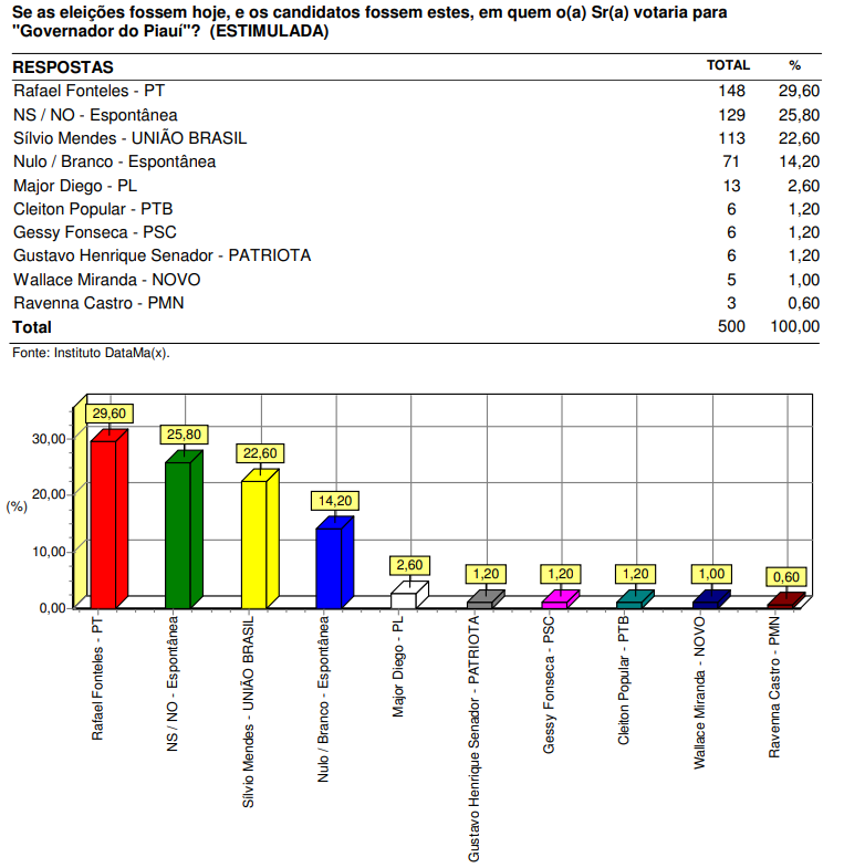 A pesquisa do Instituto Datamax em Parnaíba, segundo maior colégio eleitoral do Piauí, aponta que o pré-candidato a governador Rafael Fonteles (PT) está numericamente à frente de Sílvio Mendes (União Brasil), pré-candidato a governador correligionário e apoiado pelo prefeito da cidade, Mão Santa. Como a margem de erro é de 4,37%, os dois candidato estão tecnicamente empatados no limite da margem de erro.