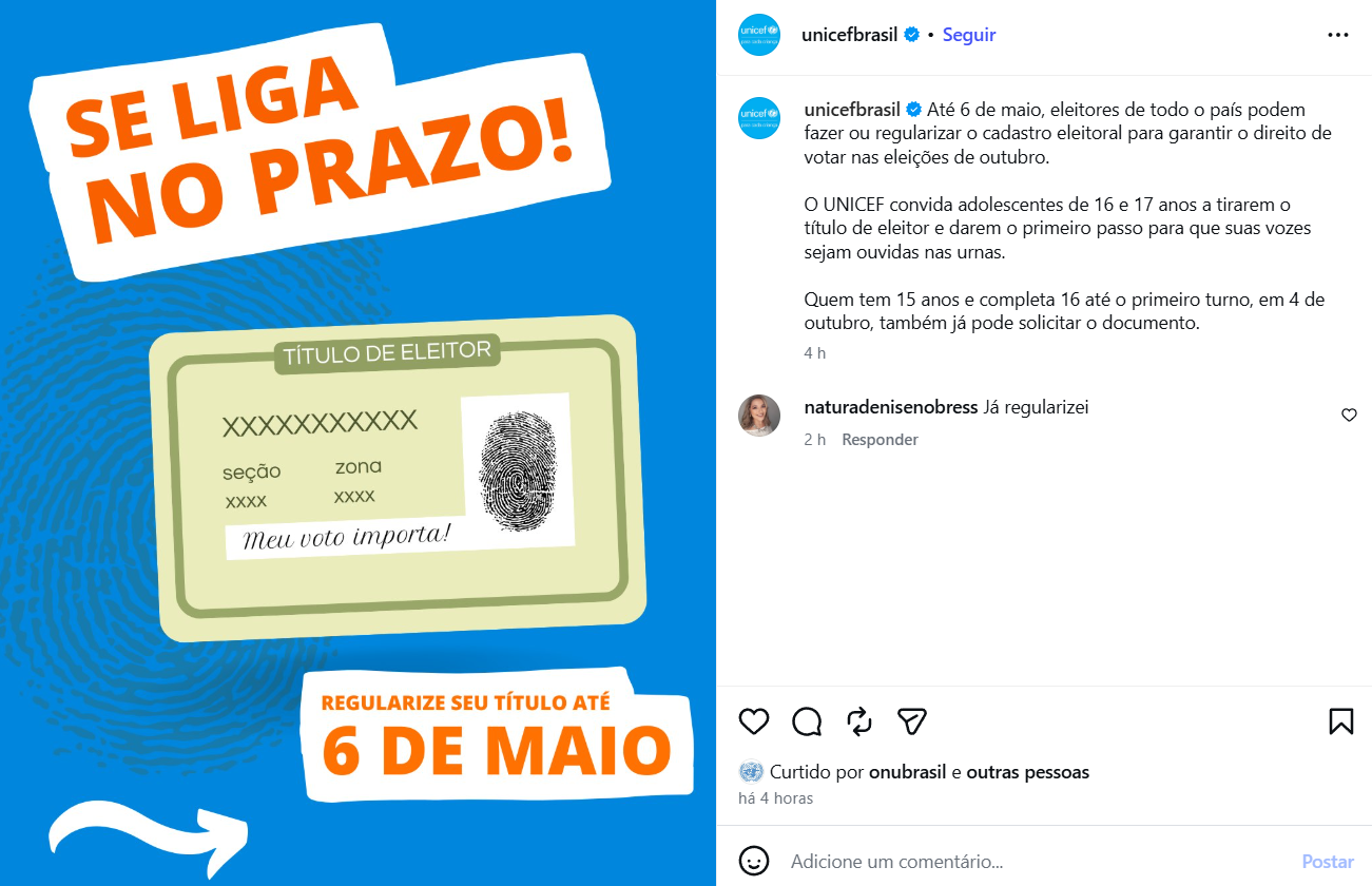 O voto nessa faixa etária é facultativo, mas, segundo o Unicef, a participação é fundamental para que as demandas dos adolescentes sejam consideradas no processo democrático. “Tirar o título é o primeiro passo para garantir que as demandas de adolescentes sejam consideradas nas eleições de outubro”, destaca Gabriela Mora, especialista em Desenvolvimento e Participação de Adolescentes do fundo.