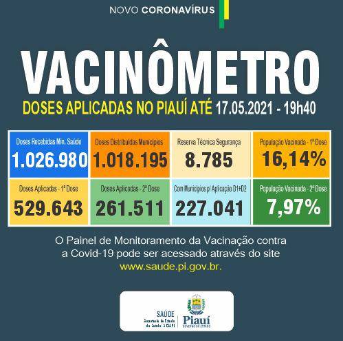 De acordo com o vacinômetro, até agora 16,14% da população está imunizada com a primeira dose e 7,97% com a segunda dose.