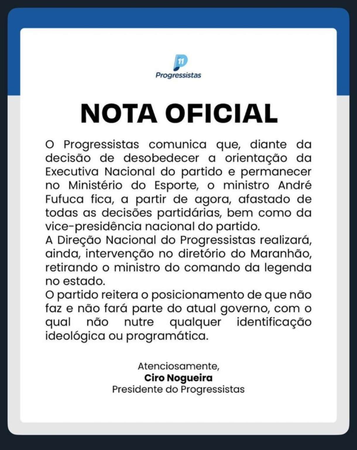 De acordo com nota oficial divulgada pelo partido, Fufuca foi afastado de "todas as decisões partidárias, bem como da vice-presidência nacional do partido". O comunicado, assinado por Ciro Nogueira, justifica a ação "diante da decisão [de Fufuca] de desobedecer a orientação da Executiva Nacional do partido e permanecer no Ministério do Esporte".