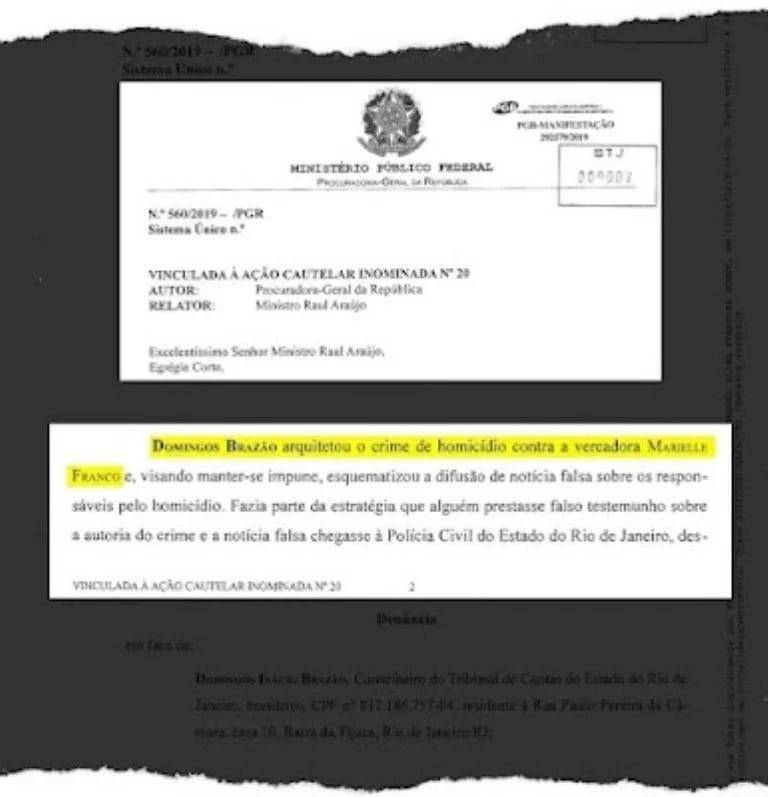 A ex-Procuradora Geral da República Raquel Dodge o acusou formalmente de participação no assassinato de Marielle afirmando que "Domingos Brazão arquitetou o crime de homicídio contra a vereadora Marielle Franco".