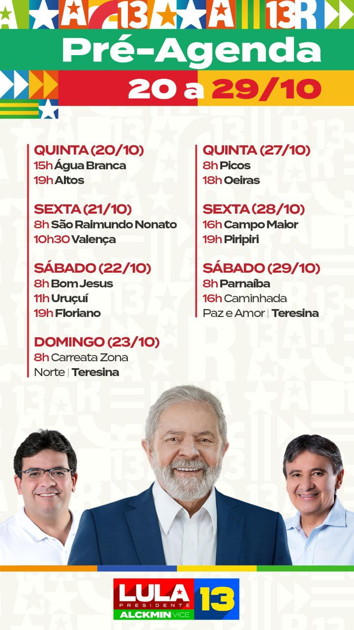 O governador eleito do Piauí, Rafael Fonteles (PT), junto ao senador eleito Wellington Dias, cumprem, entre os dias 20 a 29 de outubro, agendas no interior do estado e também na capital, em apoio à campanha do segundo turno do candidato à presidência da República, Luiz Inácio Lula da Silva.
