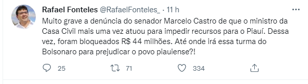 “Muito grave a denúncia do senador Marcelo Castro de que o ministro da Casa Civil mais uma vez atuou para impedir recursos para o Piauí. Dessa vez, foram bloqueados R$ 44 milhões”, postou Rafael Fonteles.