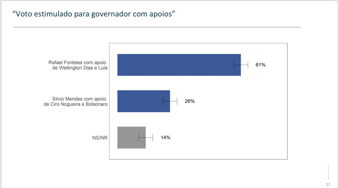 A pesquisa também aponta o crescimento de Rafael Fonteles, que tem o apoio do ex-presidente Lula e do governador Wellington Dias. Rafael Fonteles tem 61% das intenções de voto e Silvio Mendes, pré-candidato ao Governo associado ao ministro Ciro Nogueira e ao presidente Bolsonaro, tem apenas 26% das intenções de voto. Outros 14% não sabem ou não opinam.
